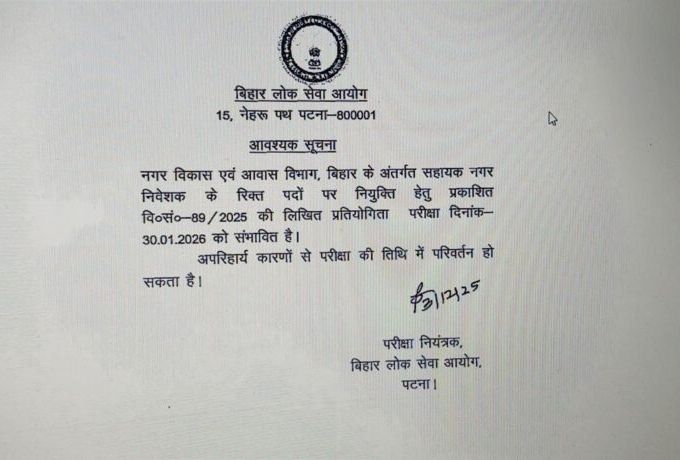 इसी बीच बिहार लोक सेवा आयोग ने अभ्यर्थियों की प्रतीक्षा समाप्त करते हुए आधिकारिक सूचना जारी कर दी है। जारी नोटिस के अनुसार सहायक नगर निवेशक (ATP) की लिखित प्रतियोगिता परीक्षा 30 जनवरी 2026 को संभावित रूप से आयोजित की जाएगी। यह सूचना अभ्यर्थियों के लिए राहत और तैयारी को लेकर स्पष्टता लेकर आई है।